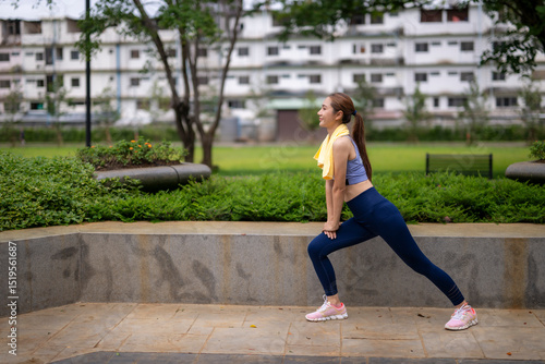 © Wasana, Fototapeta premium A woman is stretching in a park
