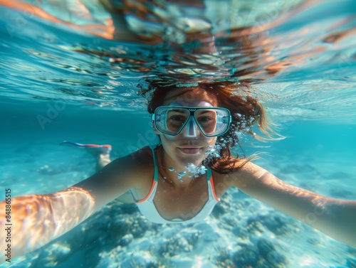 © jiawei, Fototapeta premium A woman is swimming in the ocean wearing a snorkel and goggles