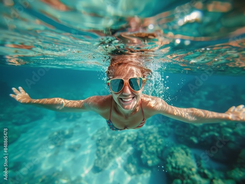 © jiawei, Fototapeta premium A woman is swimming in the ocean with her arms outstretched