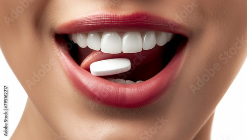 © ekhtiar, Obraz premium A woman is taking a pill in her mouth . The pill is white and small. The woman has a bright smile on her face