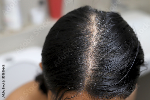 © Rattanakun, Fototapeta premium A woman is taking a shower and washing her hair in the bathroom.