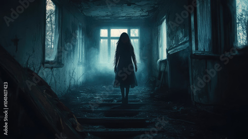 © Kanyanat, Fototapeta premium A woman is walking down a dark hallway with a creepy look on her face
