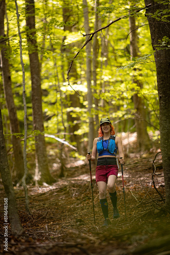 © VICTOR, Fototapeta premium A woman is walking through a forest with a backpack on