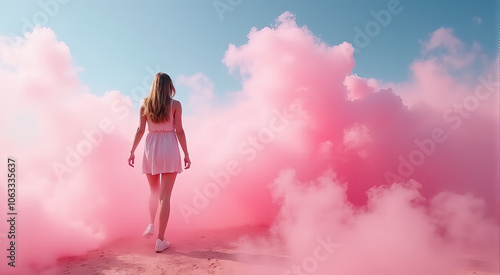 Fototapeta premium A woman is walking through a pink cloud of smoke