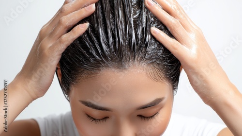 Naklejka premium A woman is washing her hair with shampoo, creating soapy bubbles, focusing on hair care and cleanliness.