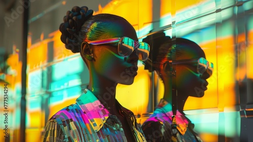 © Sodapeaw, Obraz premium A woman is wearing a colorful outfit and sunglasses. She is standing in front of a mirror, and the reflection of her outfit is also visible in the mirror. The image has a vibrant and colorful mood