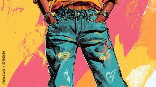 © krismicrostoker, Fototapeta premium A woman is wearing blue jeans with a logo on the back