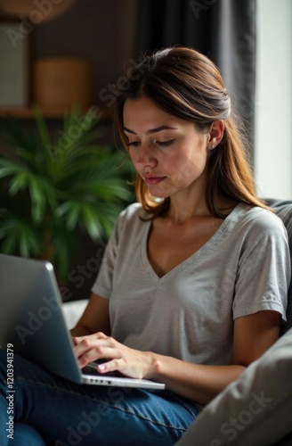 Fototapeta premium A woman is working on a laptop on the couch