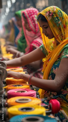 © imagineRbc, Obraz premium A woman is working on a machine that is making yarn. The yarn is in different colors and the woman is wearing a yellow scarf