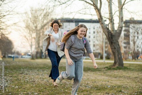 © Dejan, Obraz premium A woman joyfully chases a girl through the park, celebrating their bond with shared laughter and playfulness.