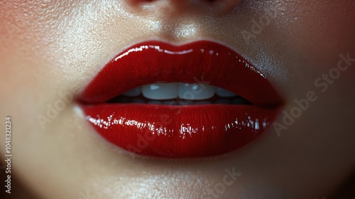 © Phetdaoheuang, Obraz premium A woman lips in a 3D close-up, with glossy red lipstick applied perfectly, showing the texture of the lips and makeup detail.