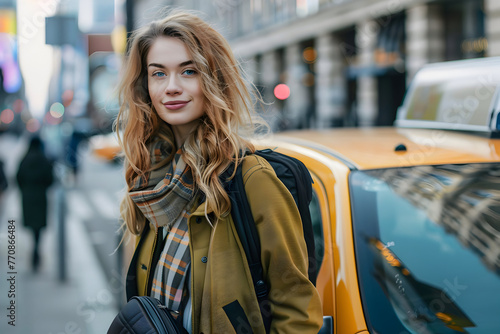 Fototapeta premium a woman looking at camera at the city street with a taxi