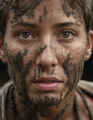© Jiraporn, Fototapeta premium A woman of varying ages with mud stains, displaying a sad expression.