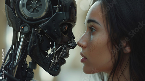 Fototapeta premium A Woman opposite AI. The concept of confrontation between humanity and...