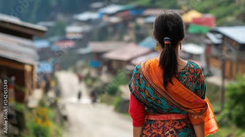 © Ariestia, Fototapeta premium A woman overlooking a village from a higher vantage point