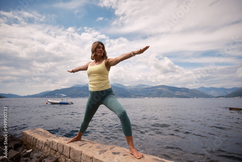 © chika_milan, Obraz premium A woman practicing yoga in warrior pose by the serene lake under a cloudy sky
