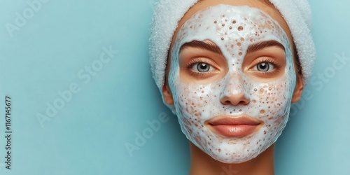 Fototapeta premium A woman relaxes while applying a cleansing facial mask that bubbles on her skin, showcasing her clear eyes and peaceful expression against a light blue backdrop