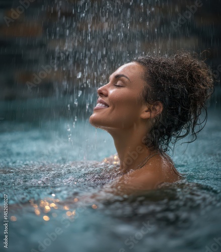 © Jannik, Fototapeta premium A woman relaxing in a spa pool, with water pouring from above
