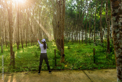 © Yaya Ernst, Obraz premium A woman runner streching before start running, morning outdoor activity
