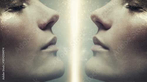 © StasySin, Obraz premium A woman's face is reflected in a mirror, with her eyes closed and a serene expression