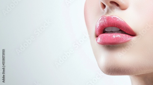 © Mey, Obraz premium A woman's face with pink lipstick and a white background.
