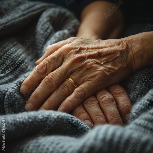 © Wuttichai, Fototapeta premium A woman's hand is resting on another woman's hand, with a gold ring on her finger.