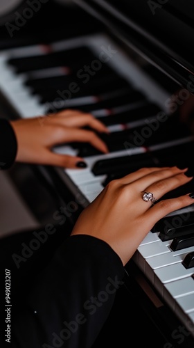Obraz premium A woman's hand with a diamond ring on a piano keyboard