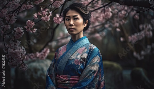 Fototapeta premium A woman's serene expression is framed by a vibrant blue kimono, as she stands among the trees, embodying the beauty and grace of traditional japanese fashion
