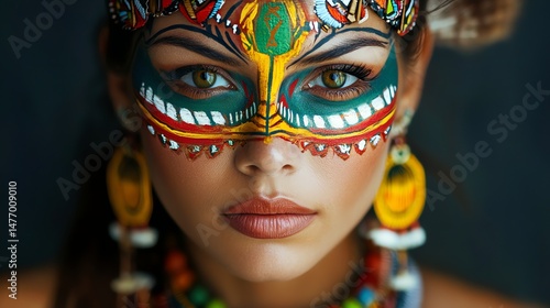 Fototapeta premium A woman?s vibrant face is adorned with intricate, colorful tribal-inspired...
