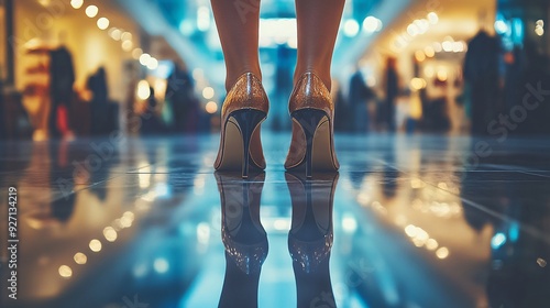© anantachat, Fototapeta premium A woman shopping for shoes at a stylish footwear boutique She tries on a pair of heels admiring her reflection in the mirror Stock Photo with copy space