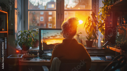 © jr-art, Naklejka premium A woman sits at a desk with a computer monitor in front of her