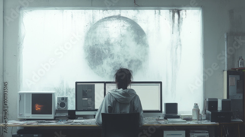 Fototapeta premium A woman sits at a desk with her back to the camera, working on a computer. A large, abstract moon image hangs in the window behind her.