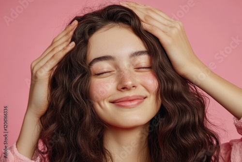Fototapeta premium A woman sits cross-legged with eyes closed, hands placed on her head in a...