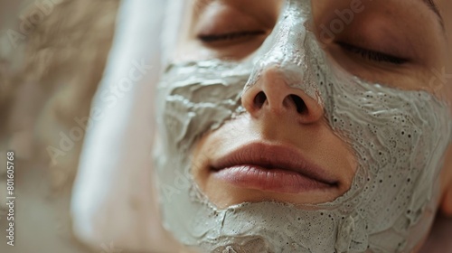 Fototapeta premium A woman sits with a facial mask being applied to her face during a skincare...