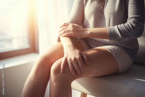 © Fotograf, Obraz premium A woman sitting on a chair with her legs crossed. Suitable for office, relaxation, or casual lifestyle themes