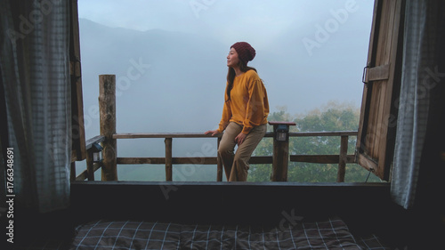 © Farknot Architect, Obraz premium A woman sitting on wooden balcony with mountain views on foggy morning outside the window