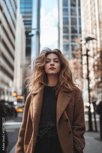 Fototapeta premium A woman standing confidently in a cityscape, exuding style and grace among towering skyscrapers.