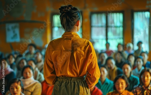 Fototapeta premium A woman standing confidently in front of a diverse crowd of people, appearing to be addressing or leading them