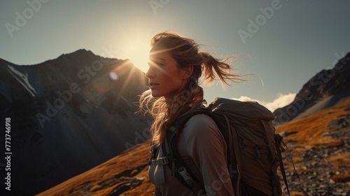Naklejka premium A woman standing on top of a mountain at sunset , A woman wearing a backpack enjoying nature in the sunlight from behind, an extraordinary natural photo
