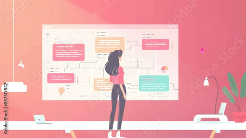 © sommersby, Obraz premium A woman stands in a minimalist office, analyzing a workflow diagram on a whiteboard. The diagram showcases interconnected boxes with text and icons