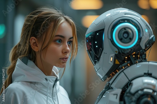 © Rayhanios, Fototapeta premium A woman stands in front of a robot with a blue face