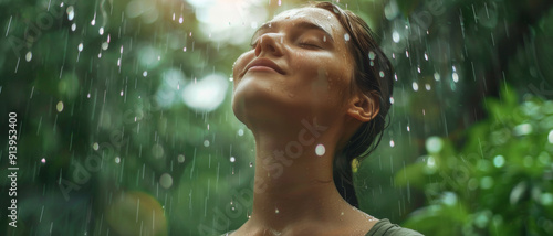 Obraz premium A woman stands peacefully in the rain, eyes closed, with raindrops falling...