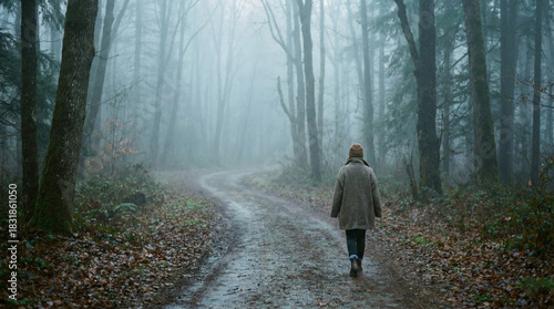 © MYDAYcontent, Naklejka premium A woman strolls along a winding path in a foggy forest during a cool day