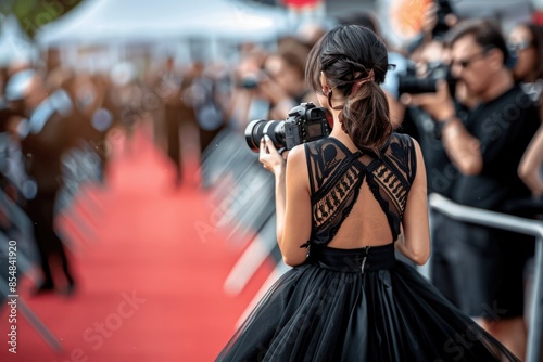 © Fotograf, Fototapeta premium A woman takes a photo of a group of people