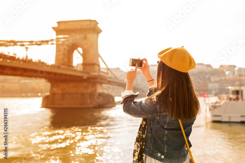 Obraz premium A woman taking pictures of the Szechenyi Bridge