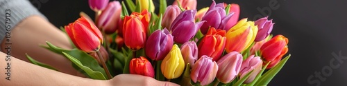 Fototapeta premium A woman tender grasp cradles a vivid array of tulips