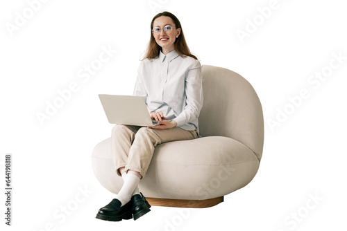 © muse studio, Naklejka premium A woman uses a laptop, a stylish designer sits in an armchair. An office employee in glasses and modern clothes.
