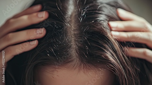 © KYR, Naklejka premium A woman visibly itching her scalp, showcasing damaged hair, in a close-up shot that emphasizes her struggle with hair health