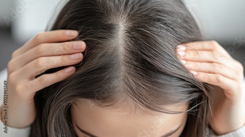 © KYR, Naklejka premium A woman visibly itching her scalp, showcasing damaged hair, in a close-up shot that emphasizes her struggle with hair health