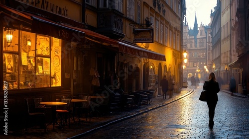 © pupus, Obraz premium A woman walking down a cobbled street at dusk